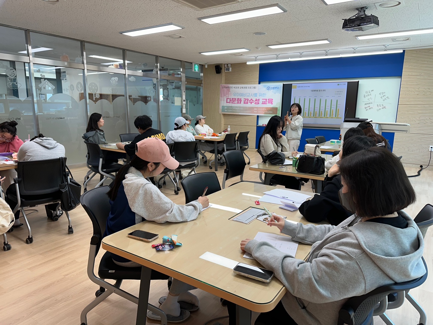 - 내용 : 다문화에 대하여 알아보고 교사가 되어가기 위한 학생들에게 교사로써 갖춰야 할 마인드와 교육방식에 대하여 배웠습니다. 자녀의 양육방식에 대해서도 배우게 되어서 유아에게 필요한 교육을 적절하게 지도할 수 있는 방법을 알아볼 수 있어 유익한 시간이였습니다.