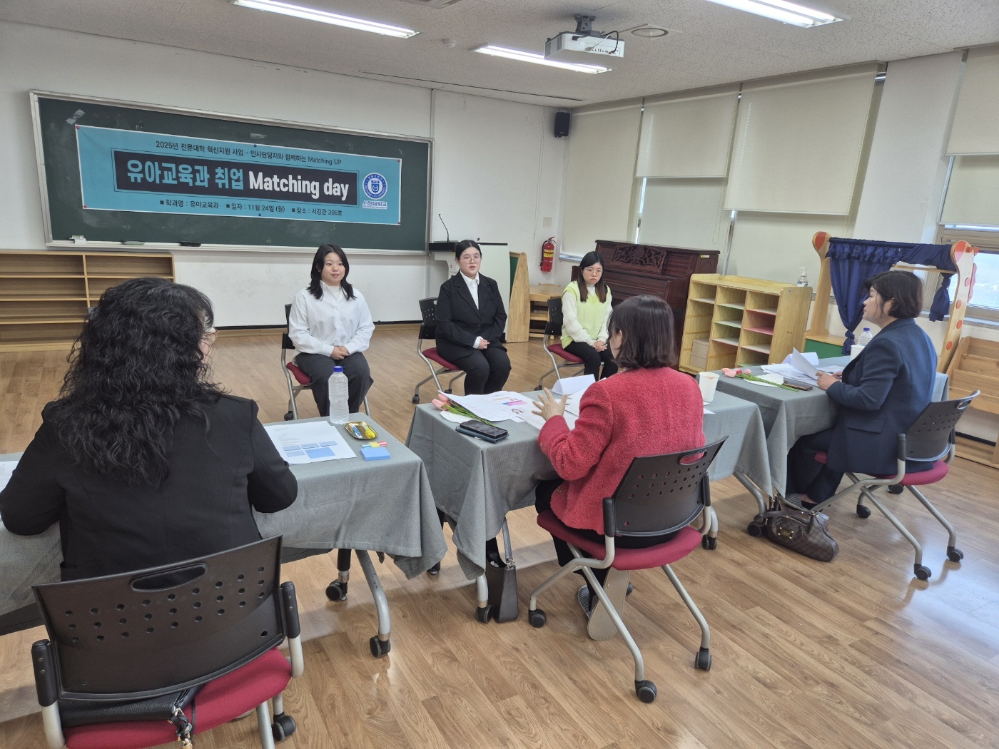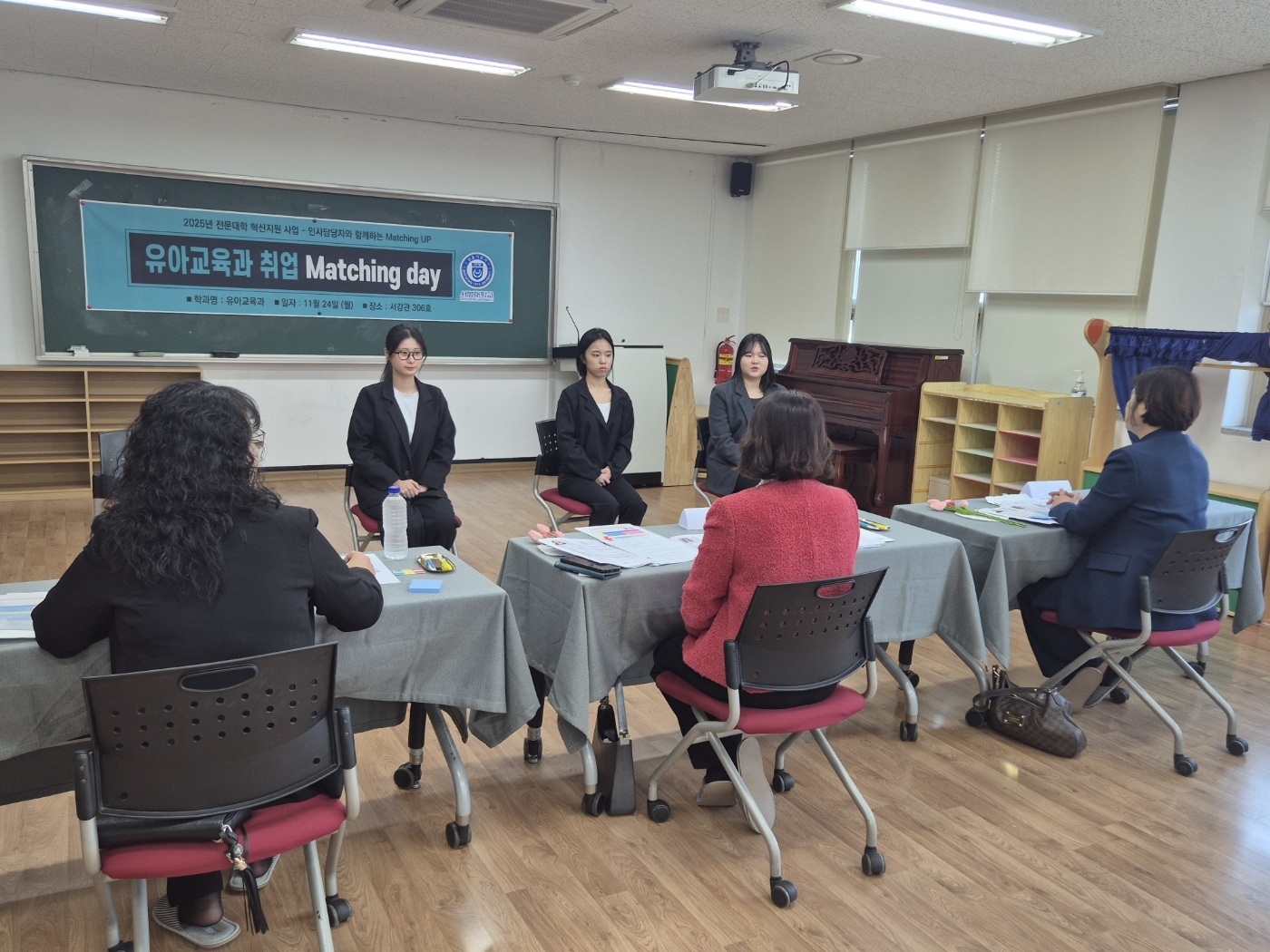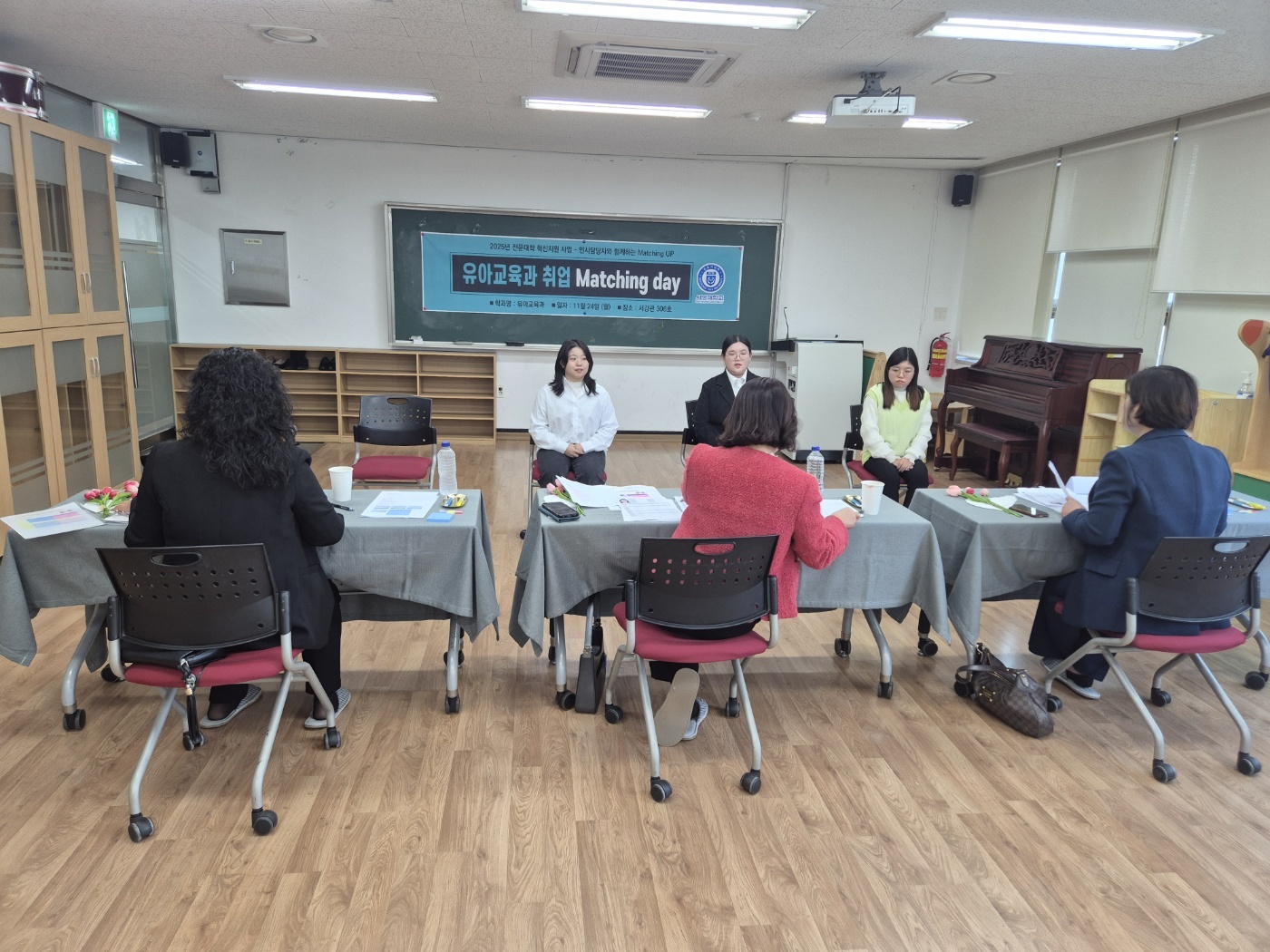 - 내용 :  취업을 앞둔 예비교사 3학년들이 취업Matching Day를 통해 면접관님들과 모의면접을 진행하고, 이력서 및 자기소개서 작성법 및 피드백을 들어보았습니다.