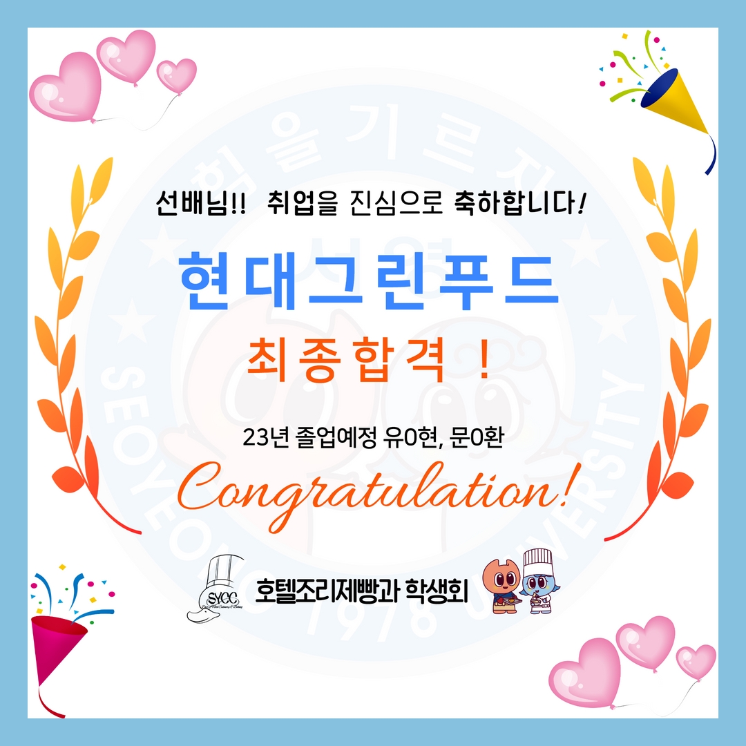 23년 졸업예정자인 유0현, 문0환 학생들이 현대그린푸드에서 최종합격에 성공했습니다!