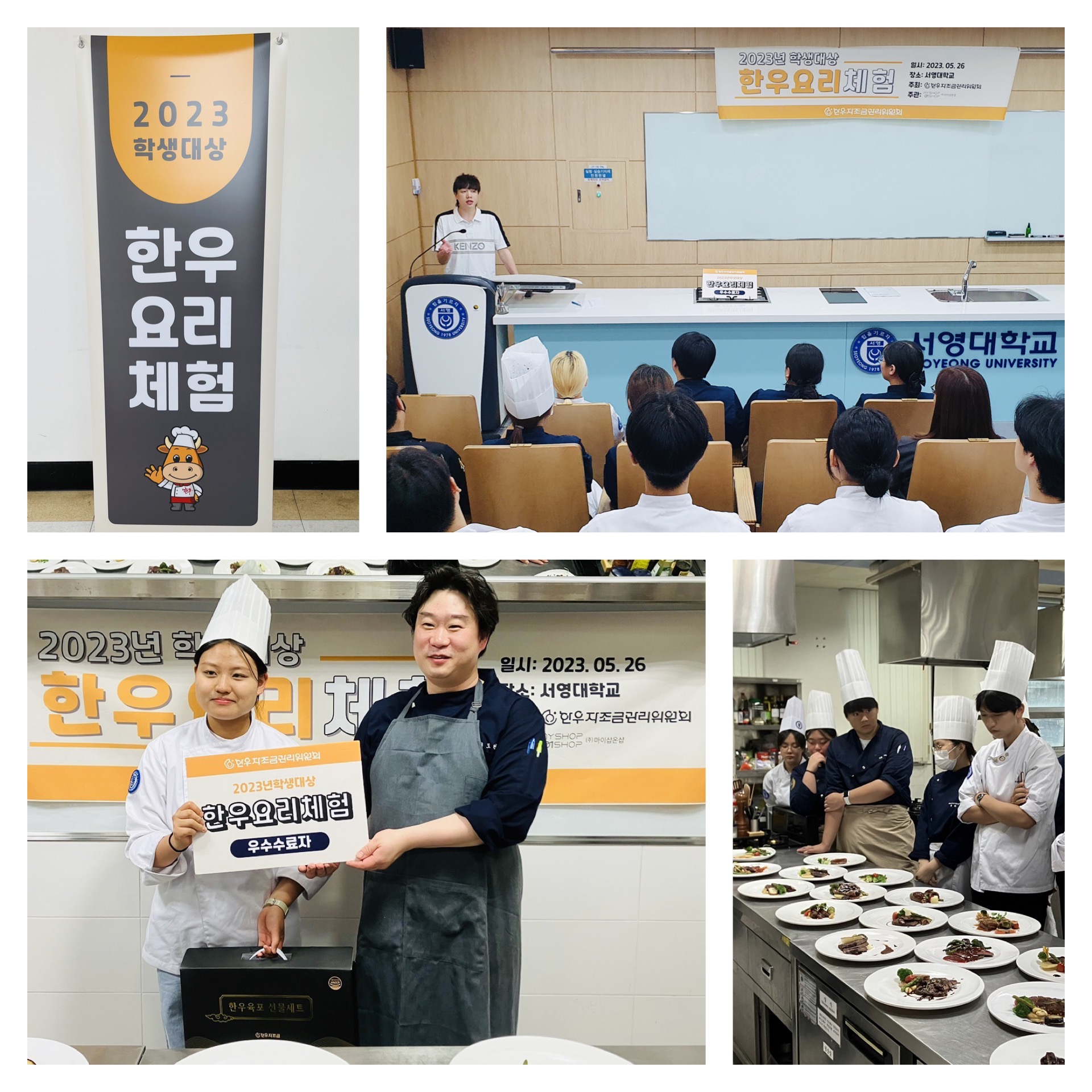 ○ 우리학과는 26일 교내 서영관 외국조리실습실에서 호텔조리제빵과 재학생 들을 대상으로 ‘2023년 한우요리체험’을 실시하였다. ○ ‘2023년 한우요리체험’은 한우자조금관리위원회 주최하는 행사이며, 조리 전공 학생들을 대상으로 한우의 우수성을 알리고 다양한 한우 요리 레시피를 발굴하여 한우소비 촉진을 도모하기 위해 기획되었다. ○ 이날 체험에 참가한 학생들 중 1학년 이슬비 학생이 한우 채끝 등심을 이용한 스테이크를 선보여 우수수료자로 선정되었으며, 부상으로 한우육포 선물세트와 함께 2023년 제6회 전국 한우요리경연대회에 서영대학교 호텔조리제빵과를 대표해 출전할 수 있는 기회를 부여 받았다.