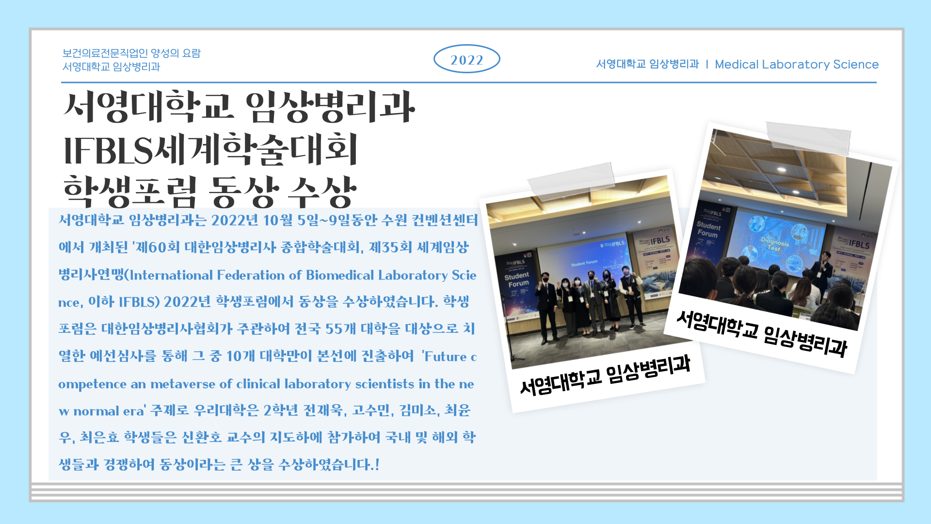 서영대학교 임상병리과는 2022105~9일동안 수원 컨벤션센터에서 개최된 60회 대한임상병리사 종합학술대회, 35회 세계임상병리사연맹(International Federation of Biomedical Laboratory Science, 이하 IFBLS)’ 2022년 학생포럼에서 동상을 수상하였습니다. 학생포럼은 대한임상병리사협회가 주관하여 전국 55개 대학을 대상으로 치열한 예선심사를 통해 그 중 10개 대학만이 본선에 진출하여 ‘Future competence an metaverse of clinical laboratory scientists in the new normal era’ 주제로 우리대학은 2학년 전재욱, 고수민, 김미소, 최윤우, 최은효 학생들은 신환호 교수의 지도하에 참가하여 국내 및 해외 학생들과 경쟁하여 동상이라는 큰 상을 수상하였습니다.!