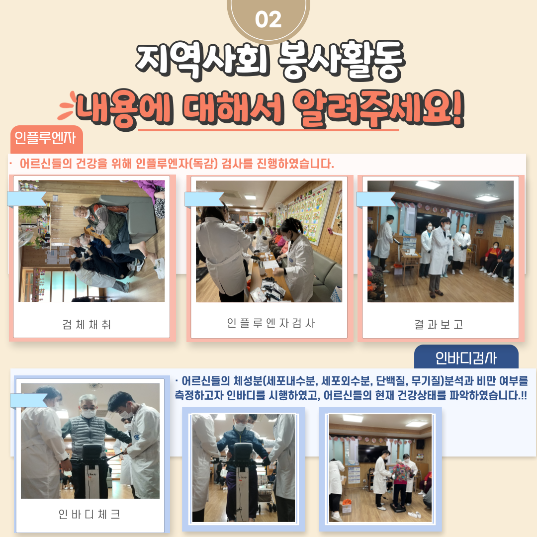 2023년 10월 30일 임상병리과 미생물/신경생리 전공동아리 회원 7명의 학생들이 신바람노인복지센터를 방문하여 어르신 이동건강검진 봉사활동을 실시하였습니다. 이번 봉사활동은 매년 정기적으로 주간보호센터에 계시는 노인분들을 위한 임상병리과만의 자원봉사활동으로 지역주민들과 함께 학생들의 인성함양을 위한 뜻깊은 행사로 진행하고 있습니다. 이번 봉사활동은 어르신의 건강을 위해 인플루엔자 검사와 인바디 체크 등 다양한 활동으로 진행되었습니다.