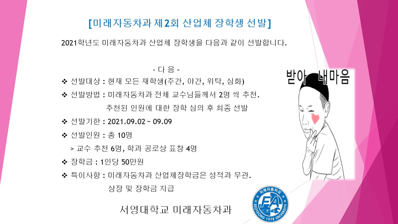 상기와 같이 미래자동차과 산업체 장학생을 선발합니다.